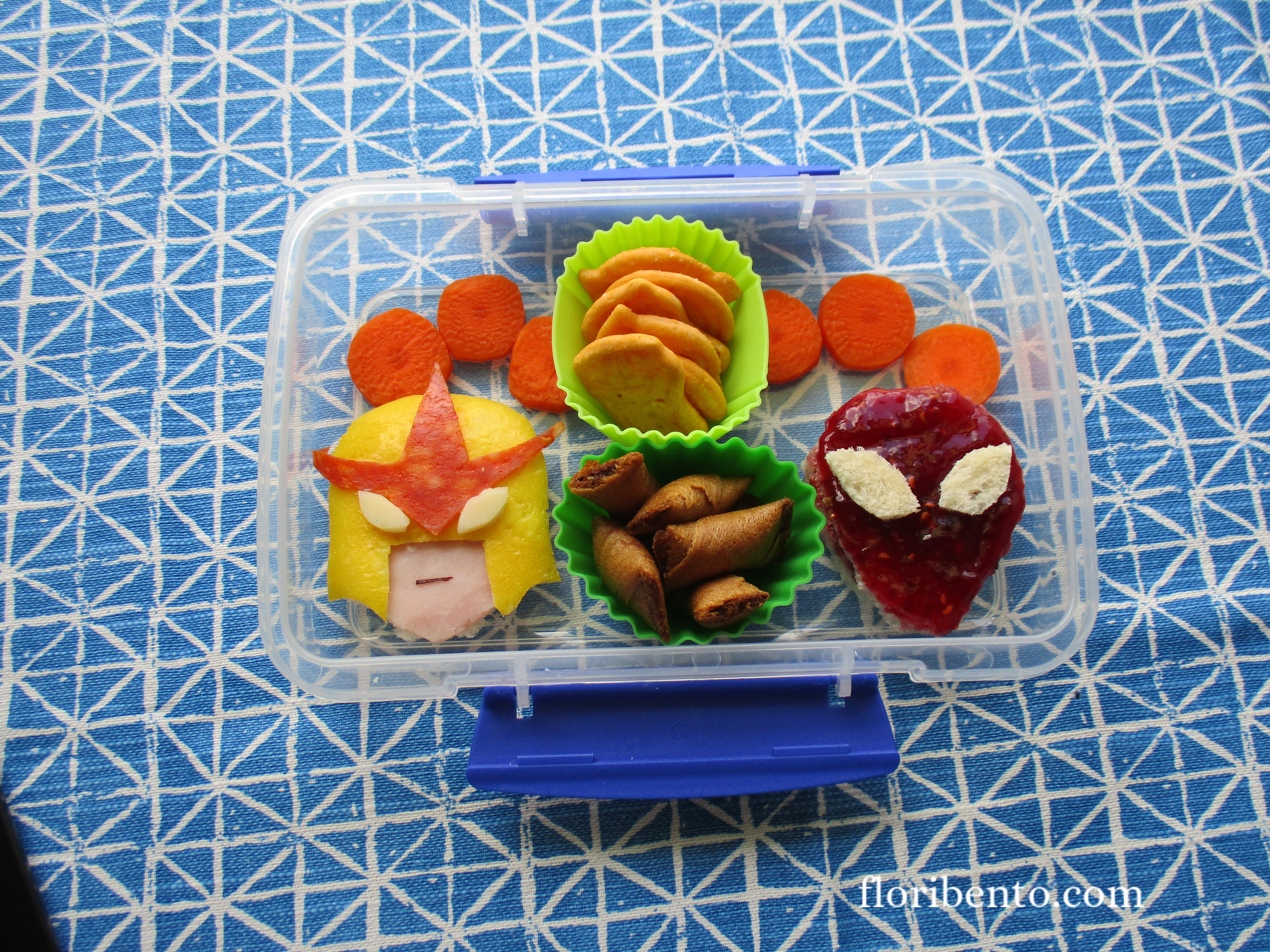 The littles are pretty big fans of the Ultimate Spider Man cartoon series (the one where Spidey joins forces with S.H.E.I.L.D. and a whole crew of teen heroes – check it out if you like action cartoons and haven’t caught this one, it’s pretty good). So when my son need a packed lunch for playgroup, it was time to make his favorite characters: Nova and, of course, Spidey himself.
