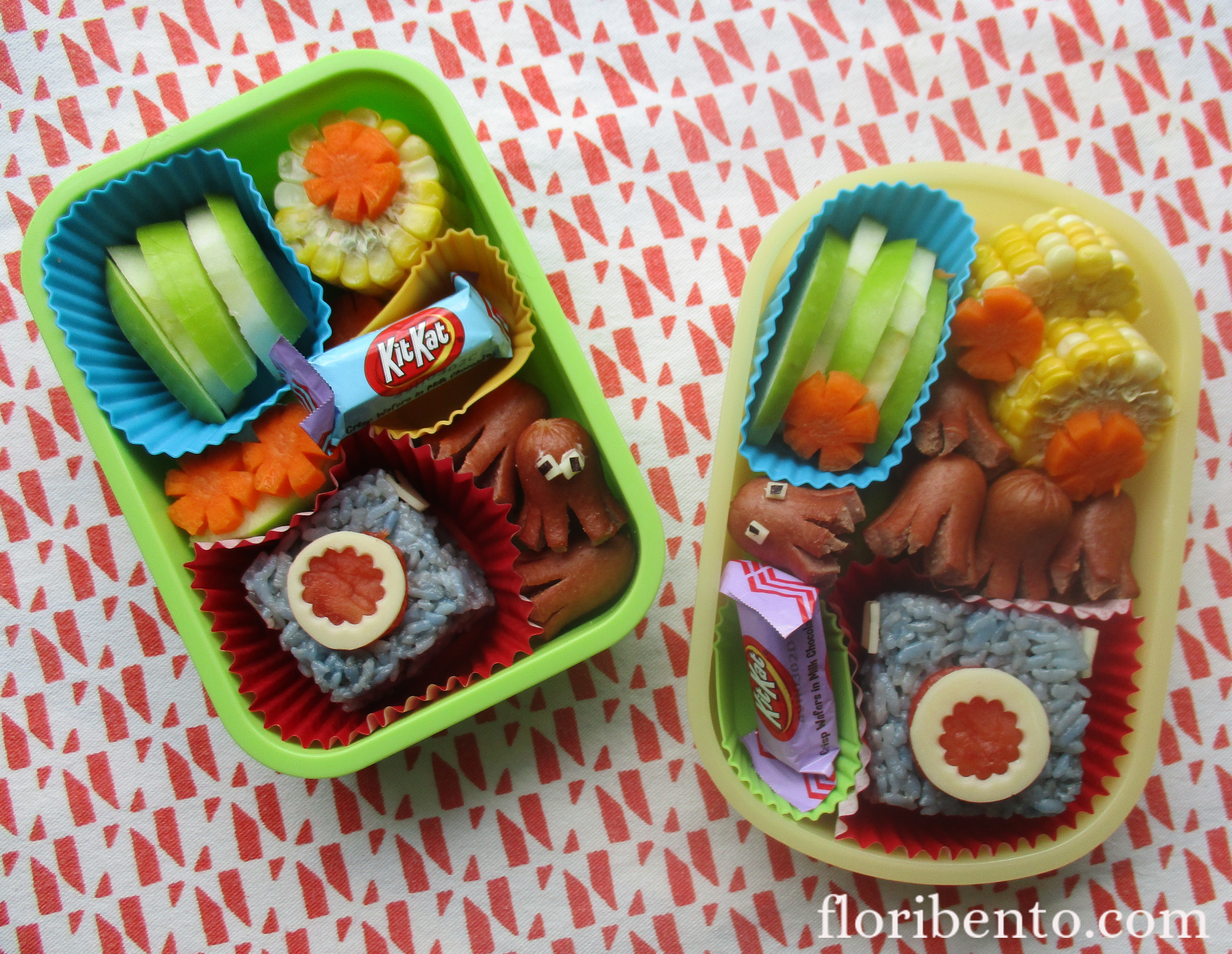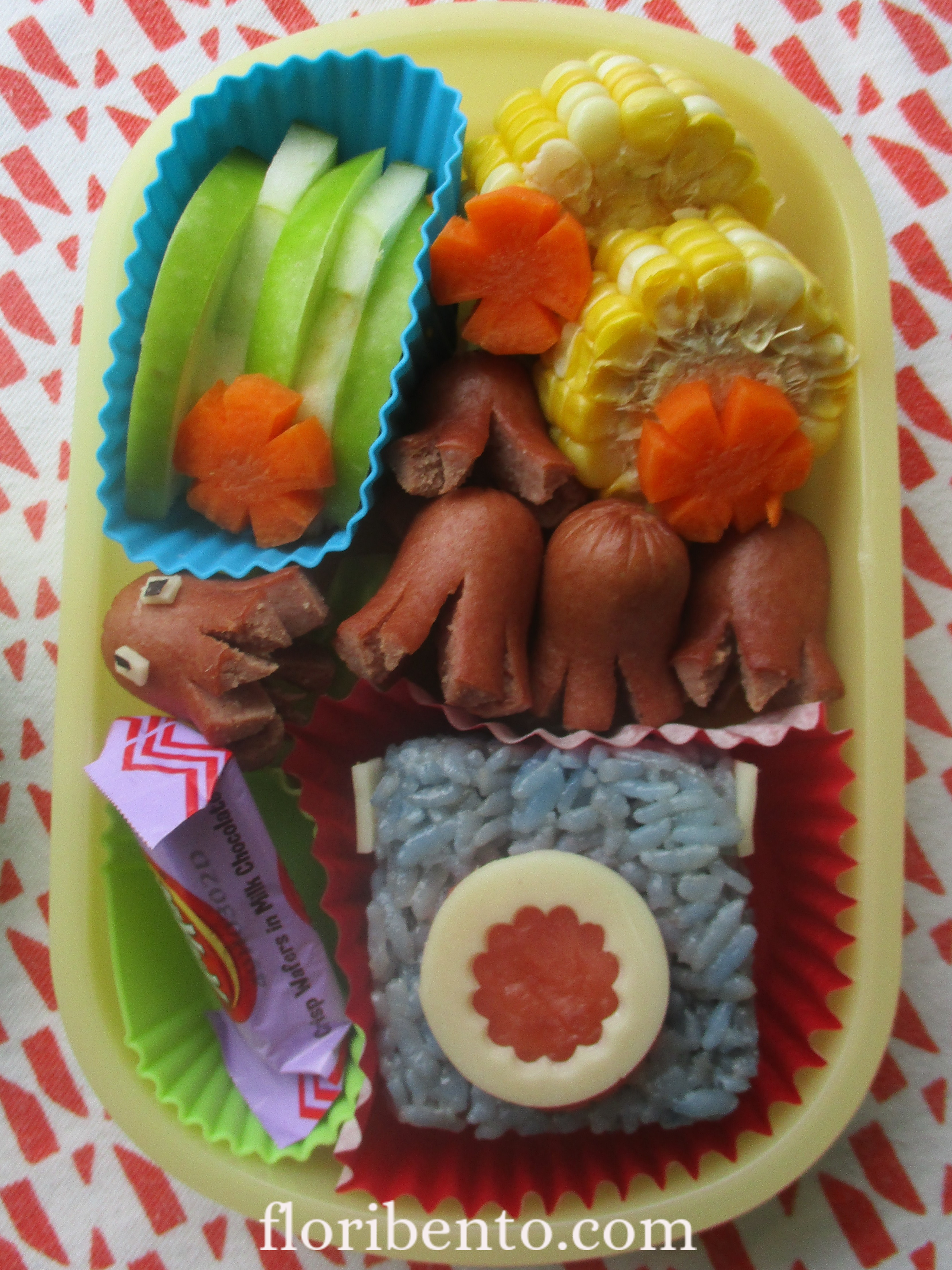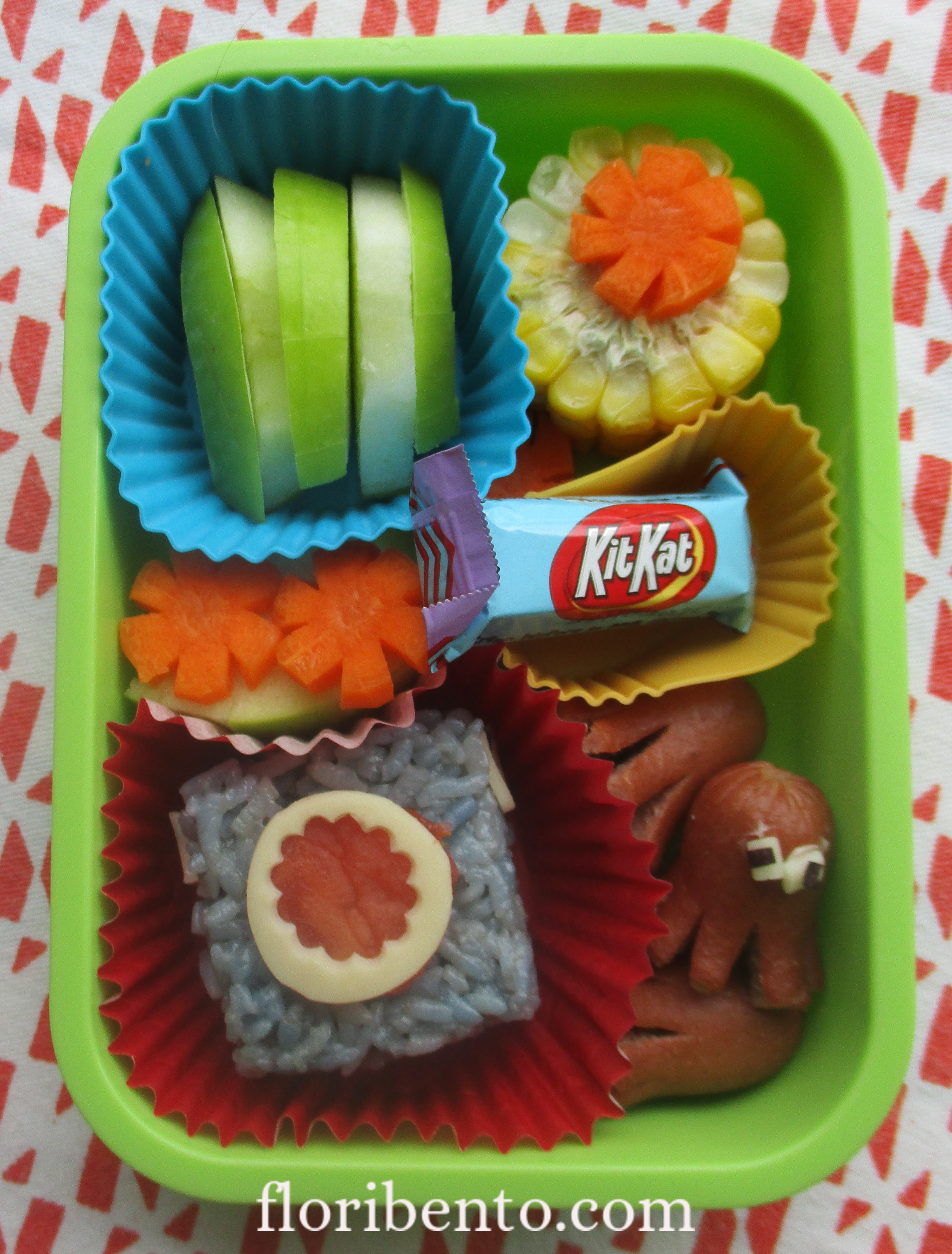 The sides are a school of hot dog octopi (some cephalopod pals for Squid), carrot flowers, sliced green apples, and rounds of corn. The ubiquitous mini KitKat shows up for dessert once again.