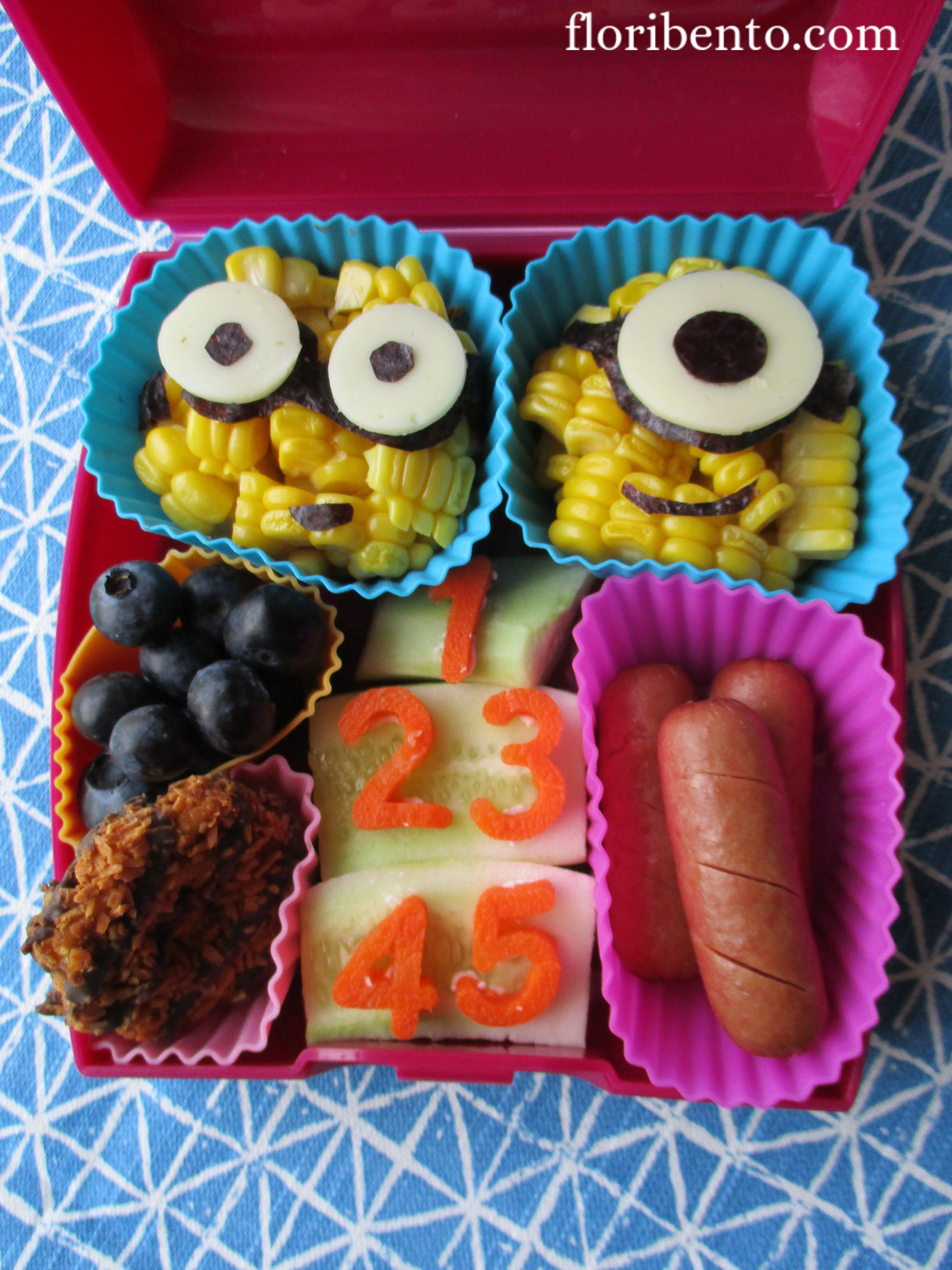 The Minions are silicone cups full of corn kernels. The details are done with freehand cut nori and white American cheese.