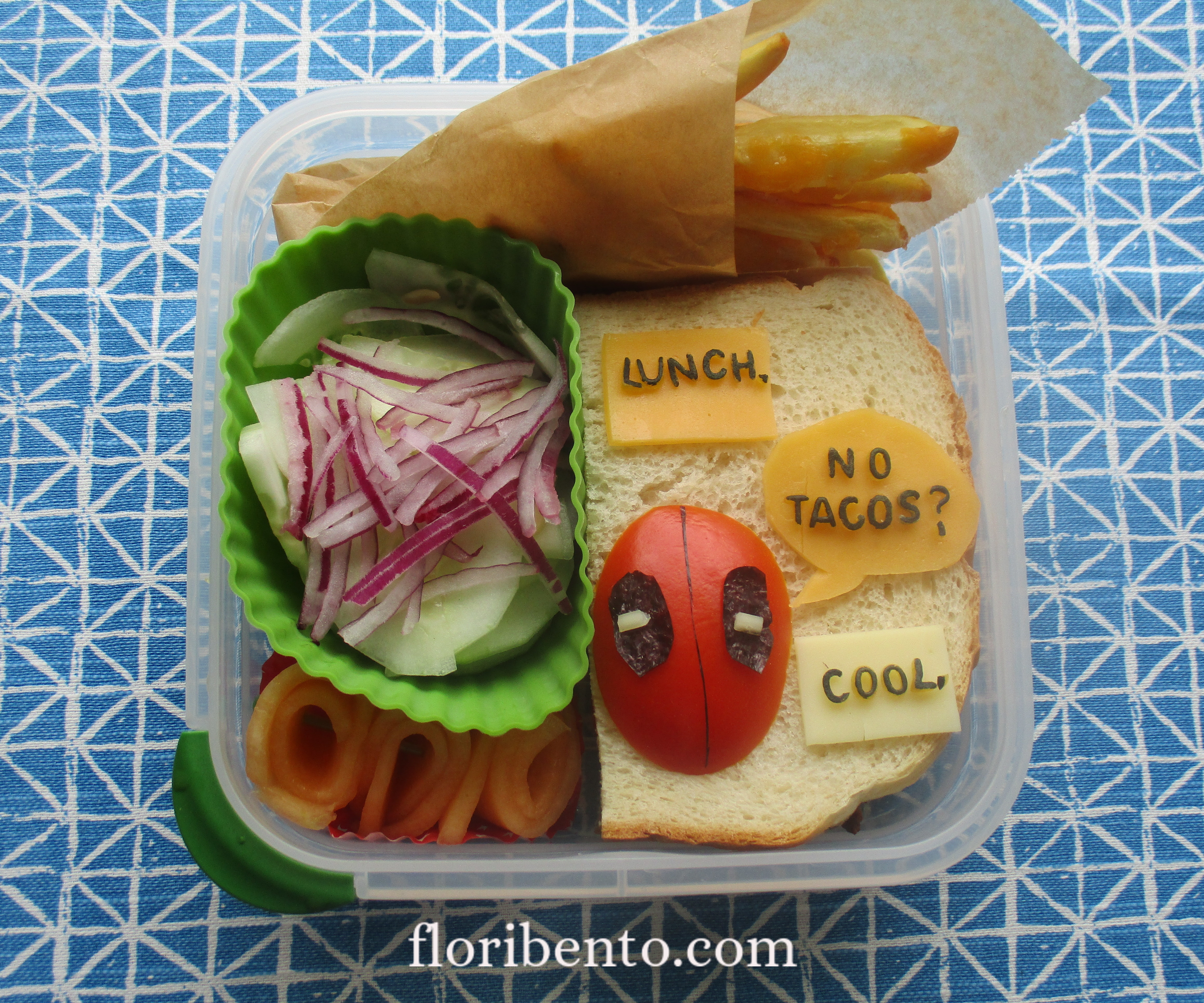 Since Deadpool isn’t kid friendly, this bento featuring the Merc with a Mouth got to be mine, all mine.